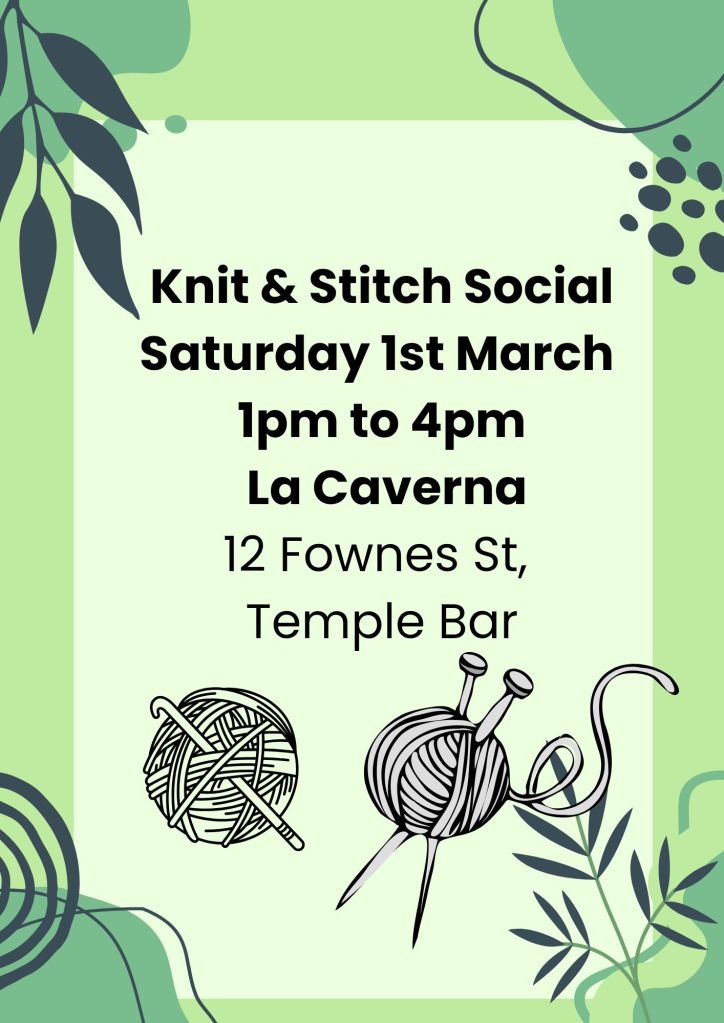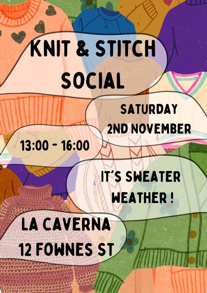 Saturday 5th April is the next monthly Knit and Stitch Social at La Caverna Restaurant. Bring your WIP’s and join a vibrant community of crocheters, knitters and stitchers for an afternoon of laughter and the love of yarn.