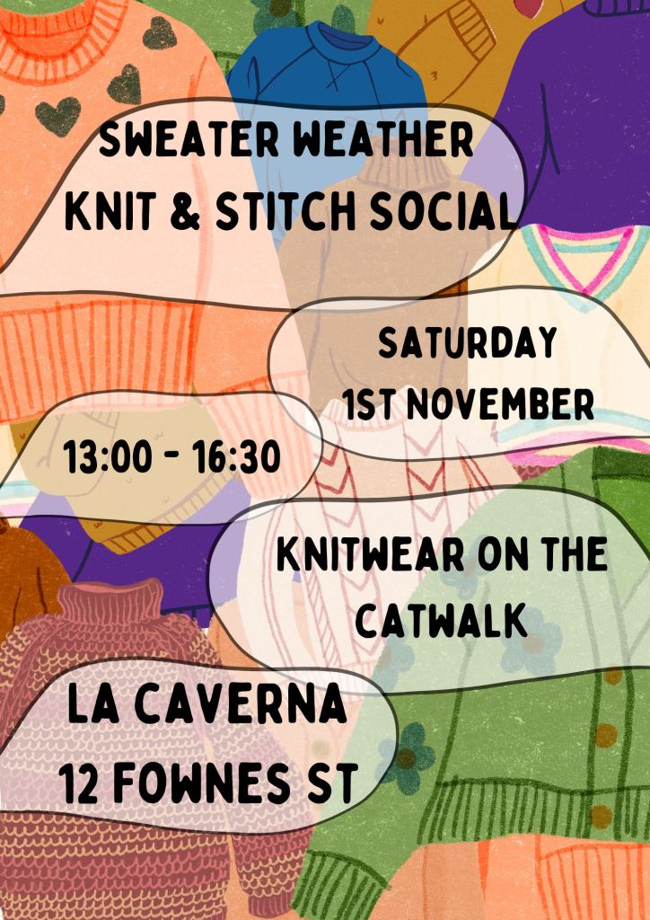 It’s time to announce the next knit social, Little Knitmas, is being held on Saturday 4th January, 1pm to 4pm at La Caverna.